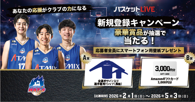 今シーズンも後半戦に突入し、さらに熱い試合が続くこの時期に「バスケットLIVE 新規登録キャンペーン」を実施いたします。バスケットLIVEの新規ご利用登録&視聴を行っていただき、応募フォームからエントリーしていただくと、抽選で選べる豪華賞品が当たるキャンペーンを実施いたします。下記のクラブ専用URLから登録を行っていただくことでクラブへの支援にも繋がりますので、既にご登録いただいている方はお近くの皆さまにもご紹介頂きますようお願いいたします!
