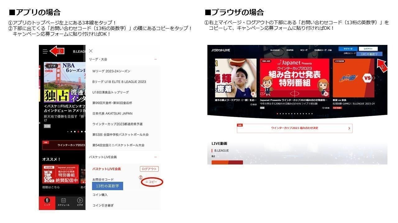 ・応募にはバスケットLIVEの「お問い合わせコード」が必要です